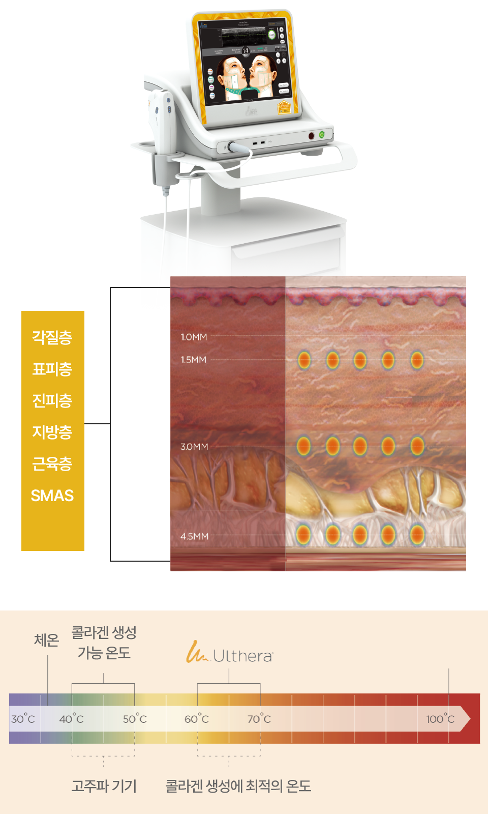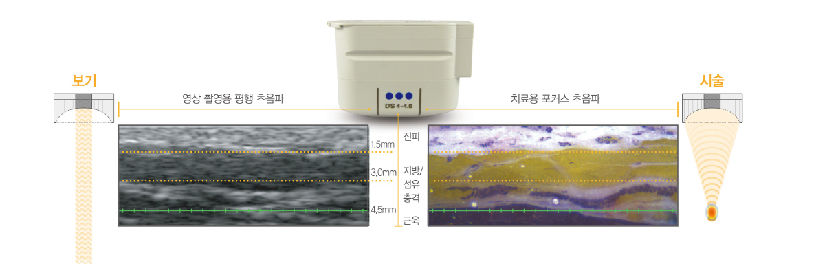 돋보기로 빛을 모아 종이를 태우는 것과 같이, 60~70℃의 고강도 초음파 에너지를 피부 표면 아래 SMAS층까지 집중 전달하여