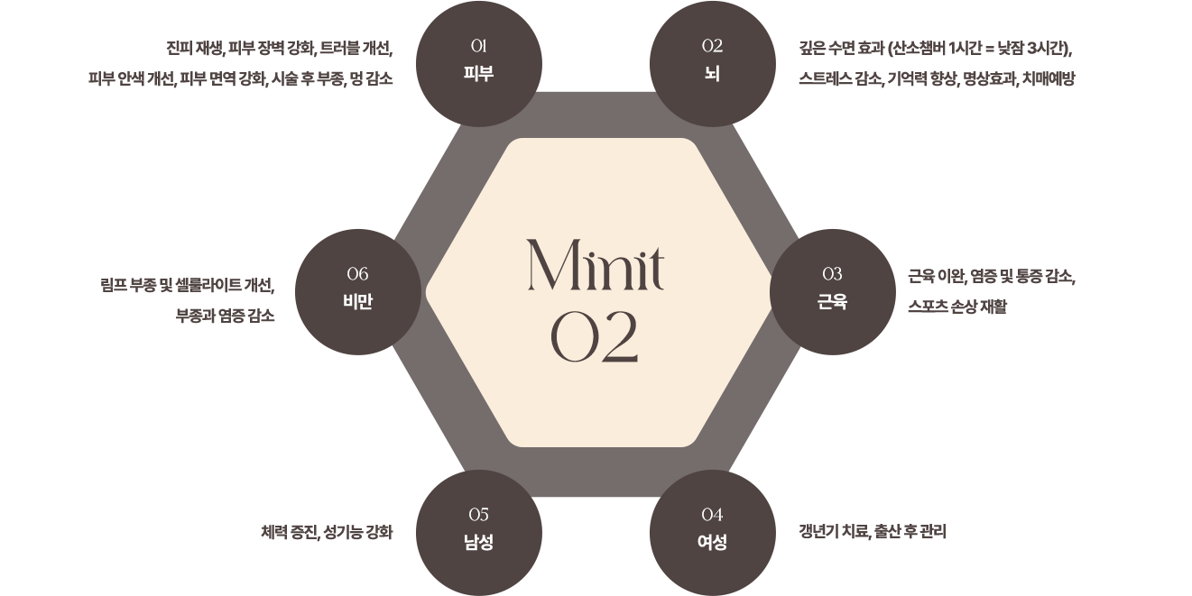산소가 결핍된 인체 내 산소를 공급해주어 전체적인 컨디션을 회복을 도와줍니다.